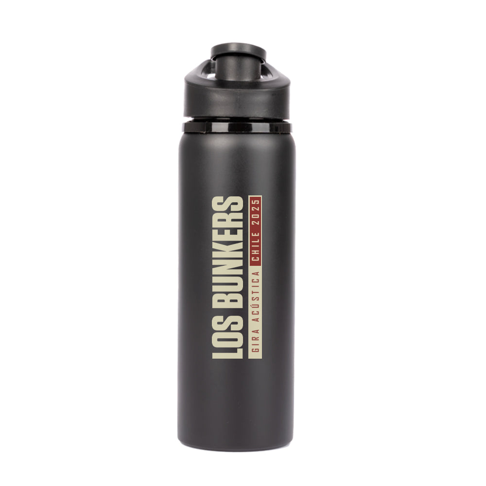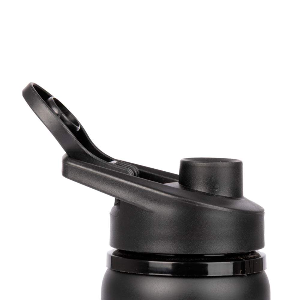 Botella metálica de Acero Inoxidable, con tapa rosca de plástico PP negro, asa de sujeción y anillo de silicona, anti-derrame.