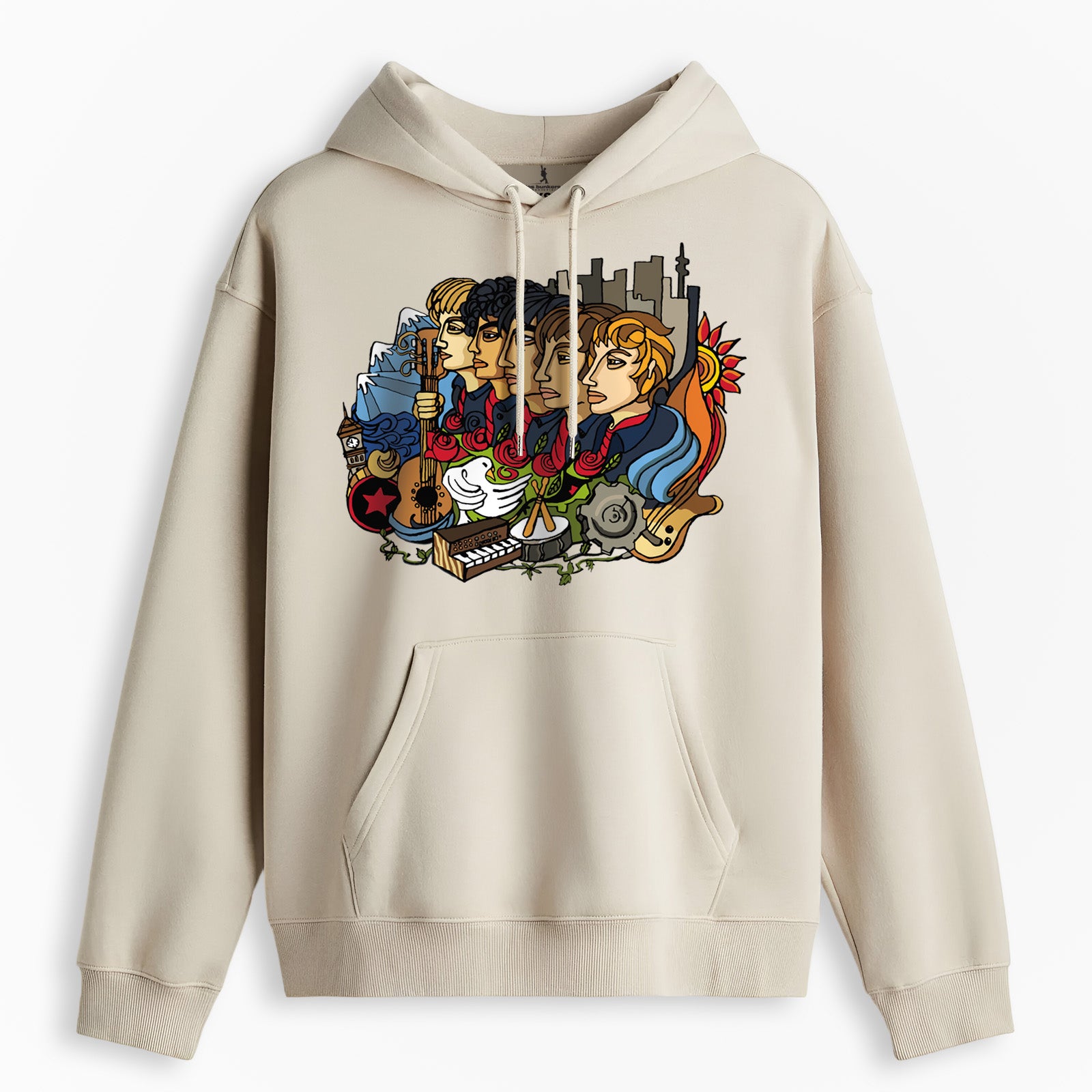 Polerón beige, 100% algodon con capucha y bolsillo tipo canguro, estampado frontal ilustración álbum La Culpa, estampado posterior logo Los Bunkers.
